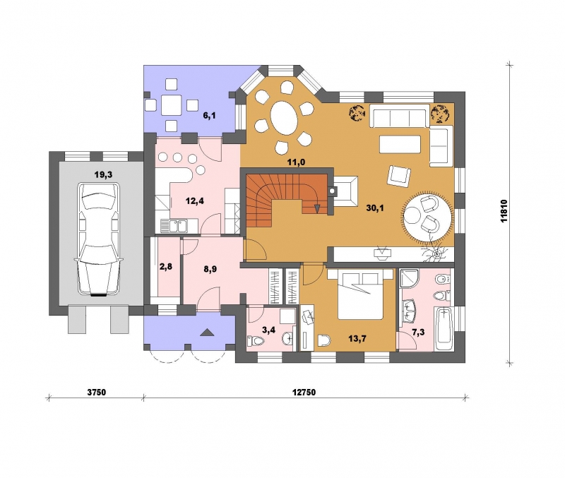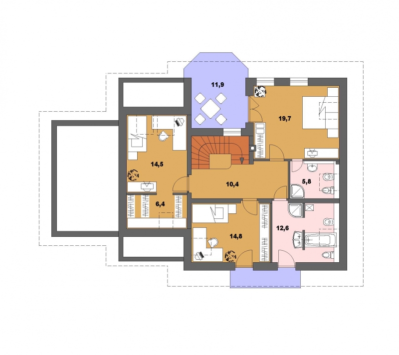 • Jantár 111/46 * je dom väčšej veľkostnej kategórie s 5 obytnými miestnosťami * svojimi rozmermi uspokojí nároky 6-7 člennej rodiny * rodinný dom je možné postaviť so suterénom * uzavretím terasy na poschodí dostaneme šatník * z bočnej strany domu je možné umiestniť ešte jednu garáž * presklením prekrytej terasy dostaneme zimnú záhradu prístupnú z kuchyne