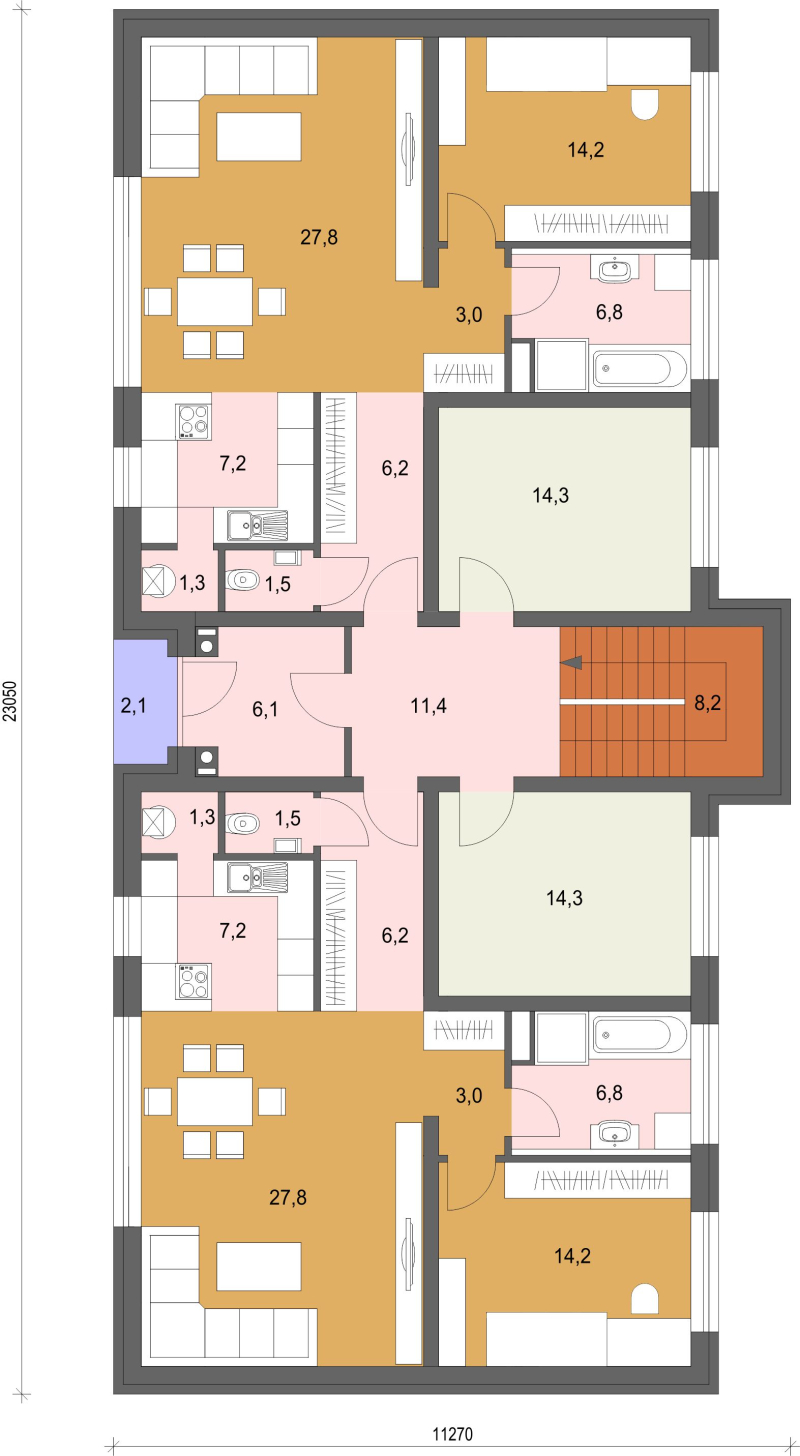Obytný dom VII sa skladá z troch nadzemných podlaží. V dome sa nachádzajú 2 dvojizbové byty, 2 trojizbové byty a 1 štvorizbový byt. Dvojizbové a trojizbové byty na 1NP a 2NP sú pôdorysne identické. Obytný dom je možné podpivničiť.