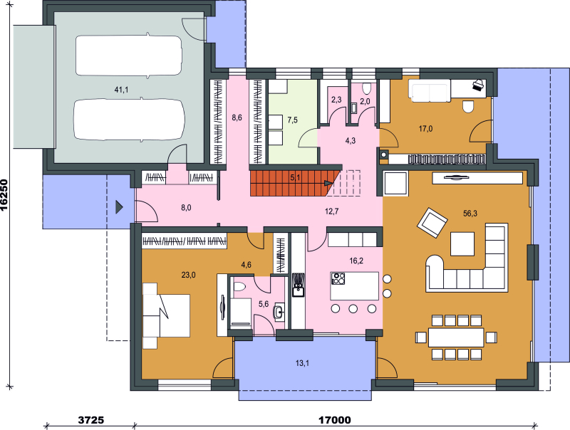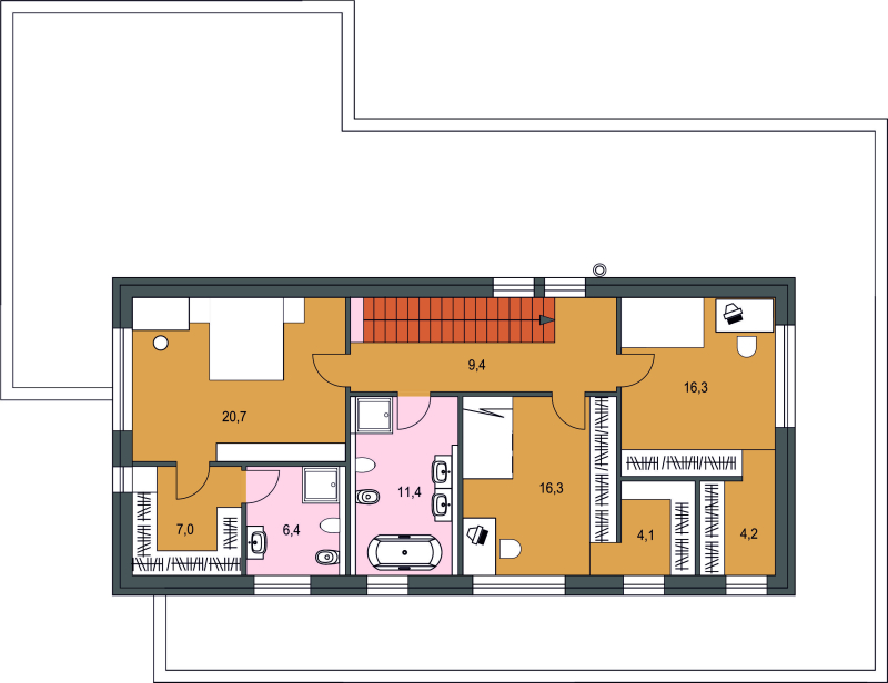• Spinel 174/507 je dvojpodlažný moderný rodinný dom s plochou strechou.  Dom je väčšej veľkostnej kategórie s 6 obytnými miestnosťami.  Priestor dvojgaráž môže slúži aj ako izba prípadne priestor na fitness.