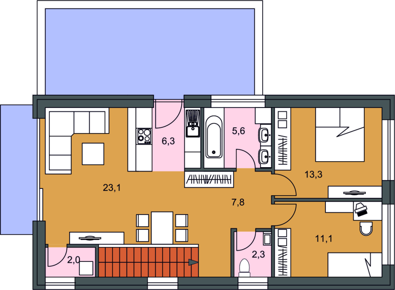 • Spinel 91/503 je dvojpodlažný moderný rodinný dom s plochou strechou.  Dom má dve samostatné bytové jednotky s tromi izbami. Dom je menšej kategórie s 2 x 3 obytnými miestnosťami.  Garáž je možné zväčšiť na dvojgaráž, prípadne realizovať na úzku parcelu bez garáže.