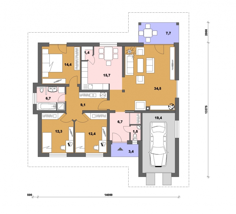 • Opál 77/234 * je dom strednej veľkostnej kategórie s 4 obytnými miestnosťami * svojimi rozmermi uspokojí nároky 4 člennej rodiny * z garáže môže vzniknúť hosťovská miestnosť, alebo pracovňa so vstupom z chodby * z bočnej strany domu je možné pristavať garáž, alebo dvojgaráž * uzavretím prekrytej terasy vytvoríme zimnú záhradu * rodinný dom je vhodný do rovinatého terénu
