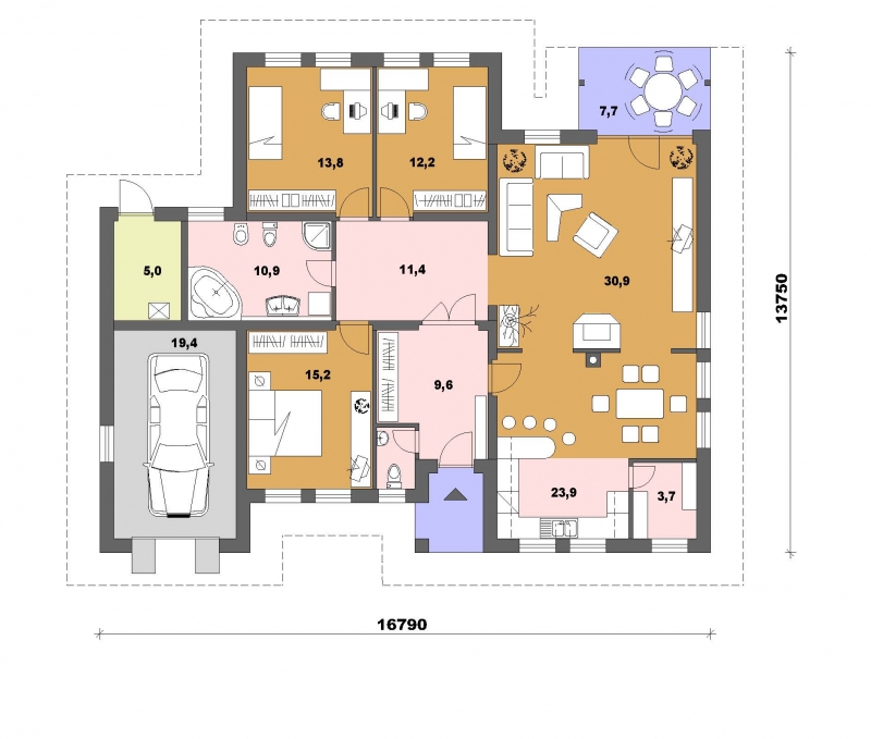 • Opál 84/90 * je dom väčšej veľkostnej kategórie vhodný do jednopodlažnej okolitej zástavby * rodinný dom má 4 obytné miestnosti, s ktorými uspokojí nároky 4-5 člennej rodiny *povalový priestor je možné využiť na skladovanie * prekrytú terasu je možné preskliť a vytvoriť zimnú záhradu * rodinný dom je vhodný do rovinatého terénu