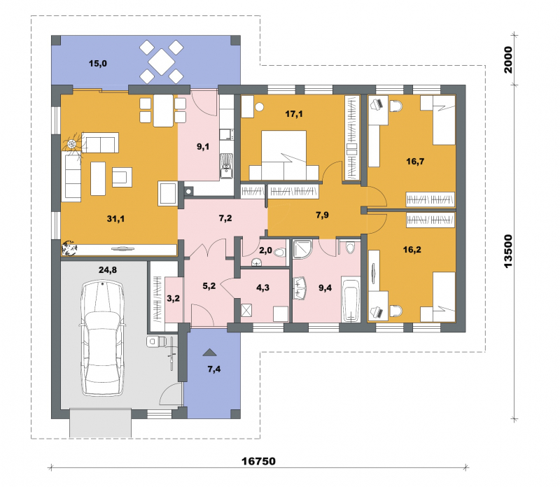 • Opál 85/292 * je dom strednej veľkostnej kategórie so 4 obytnými miestnosťami * svojimi rozmermi uspokojí nároky 4-5 člennej rodiny * spustením strechy z bočnej strany domu pri garáži je možné vytvoriť suché státie * objekt je možné čiastočne, alebo úplne podpivničiť * presklením časti terasy vytvoríme zimnú záhradu * z garáže môže byť vytvorená ďalšia izba, alebo kancelária