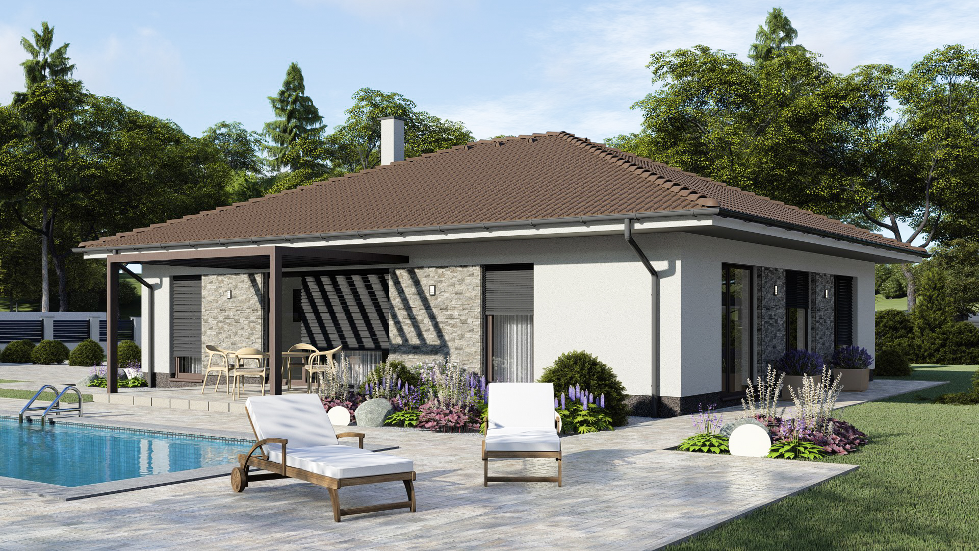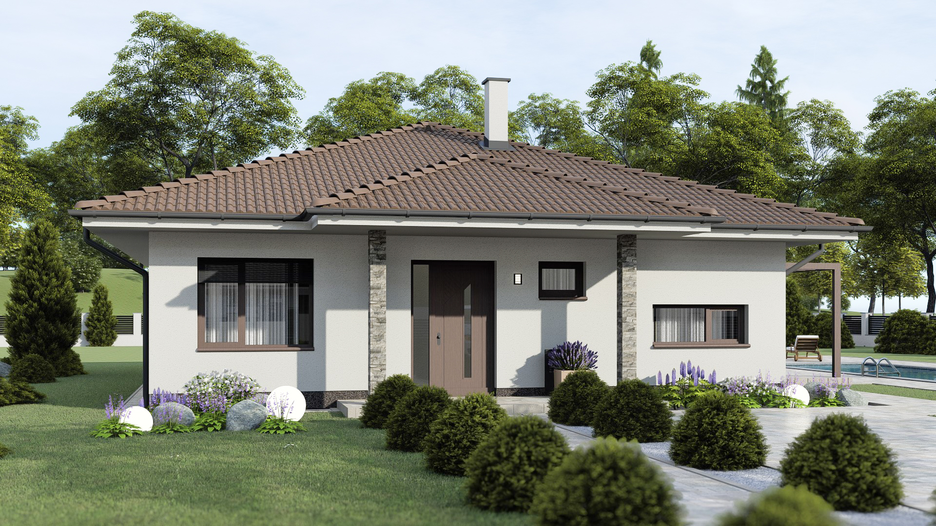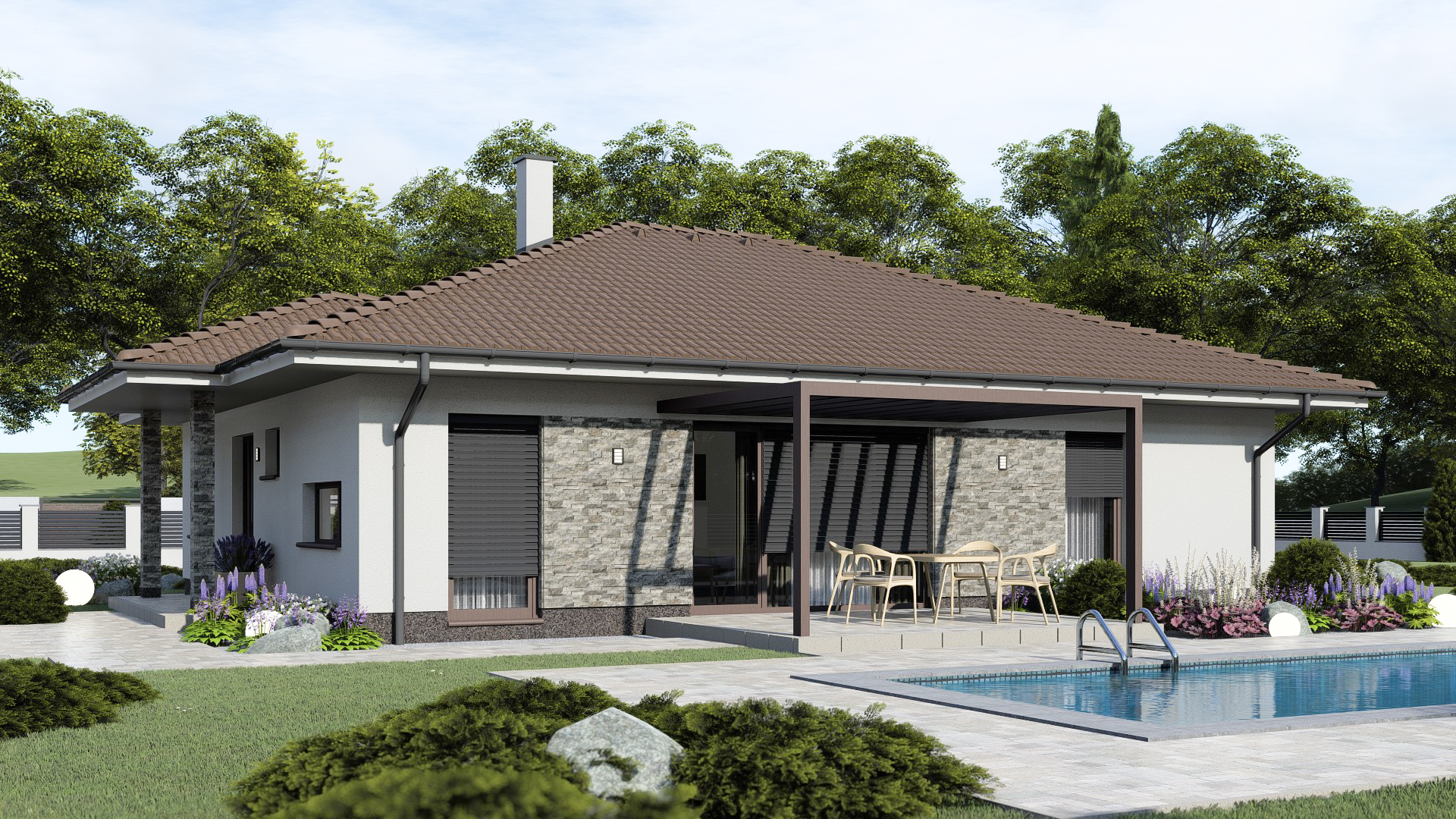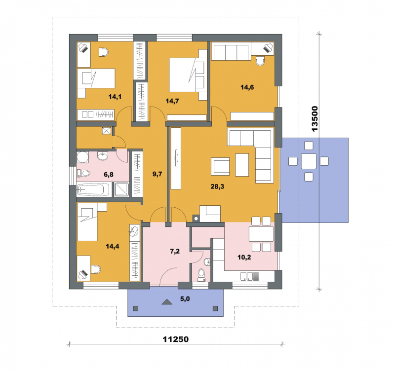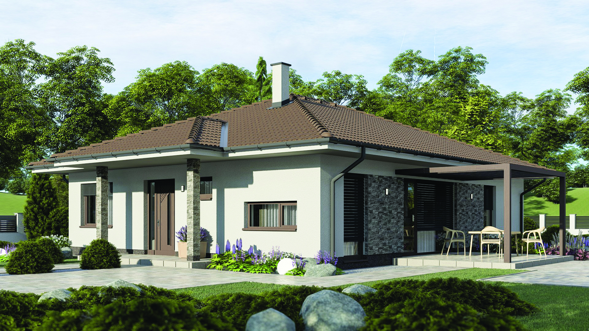 • Opál 86/336 * je dom strednej veľkostnej kategórie s 5 obytnými miestnosťami * svojimi rozmermi uspokojí nároky 4-5 člennej rodiny * spustením strechy z bočnej strany domu vytvoríme suché státie * zrušením vstavanej skrine vieme zväčšiť priestor kúpeľne na 8,3m2 * dom je vhodný do rovinatého, alebo mierne svahovitého terénu